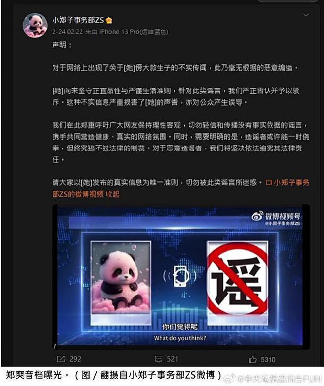 郑爽还被曝在国外给富豪做小三、做代孕,作室火速辟谣,发布郑爽哽咽录音佐证立场。