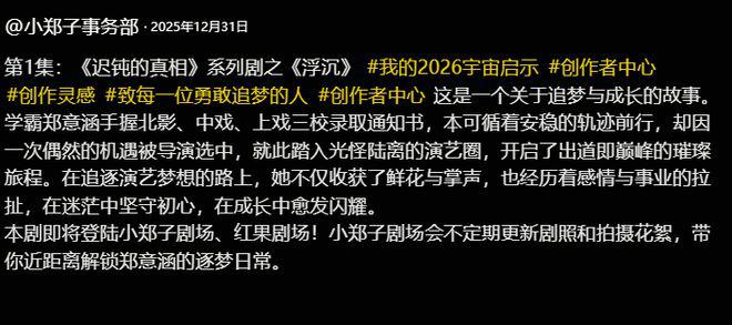 仔细想想,郑爽这一年确实遭受了很多的质疑。但要说成长,过去一年郑爽事业也有所进展。她开了一家线上的面包店;短剧也拍了好几部了。就在前一天,郑爽事务部还晒出了新剧《迟钝的真相》系列之《浮沉》的开机仪式,坚持用拍短剧的形式为郑爽发声。