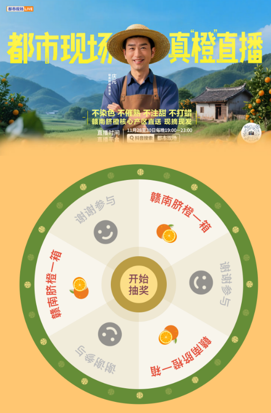 ]article_adlist-->都市现场 真“橙”送礼 ]article_adlist-->活动奖品:1箱赣南脐橙 ]article_adlist-->参与方式:11月25、26日,关注“都市现场”微信公众号,参与大转盘抽奖,即有机会获得1箱赣南脐橙,每天抽取40名粉丝,获奖名单将于第二天公布。